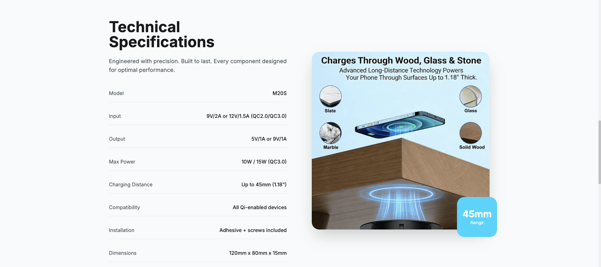 The charger works through wood, glass, marble, slate, and most solid surfaces up to 1.18" (45mm) thick. Avoid metal desks as they can interfere with wireless charging.