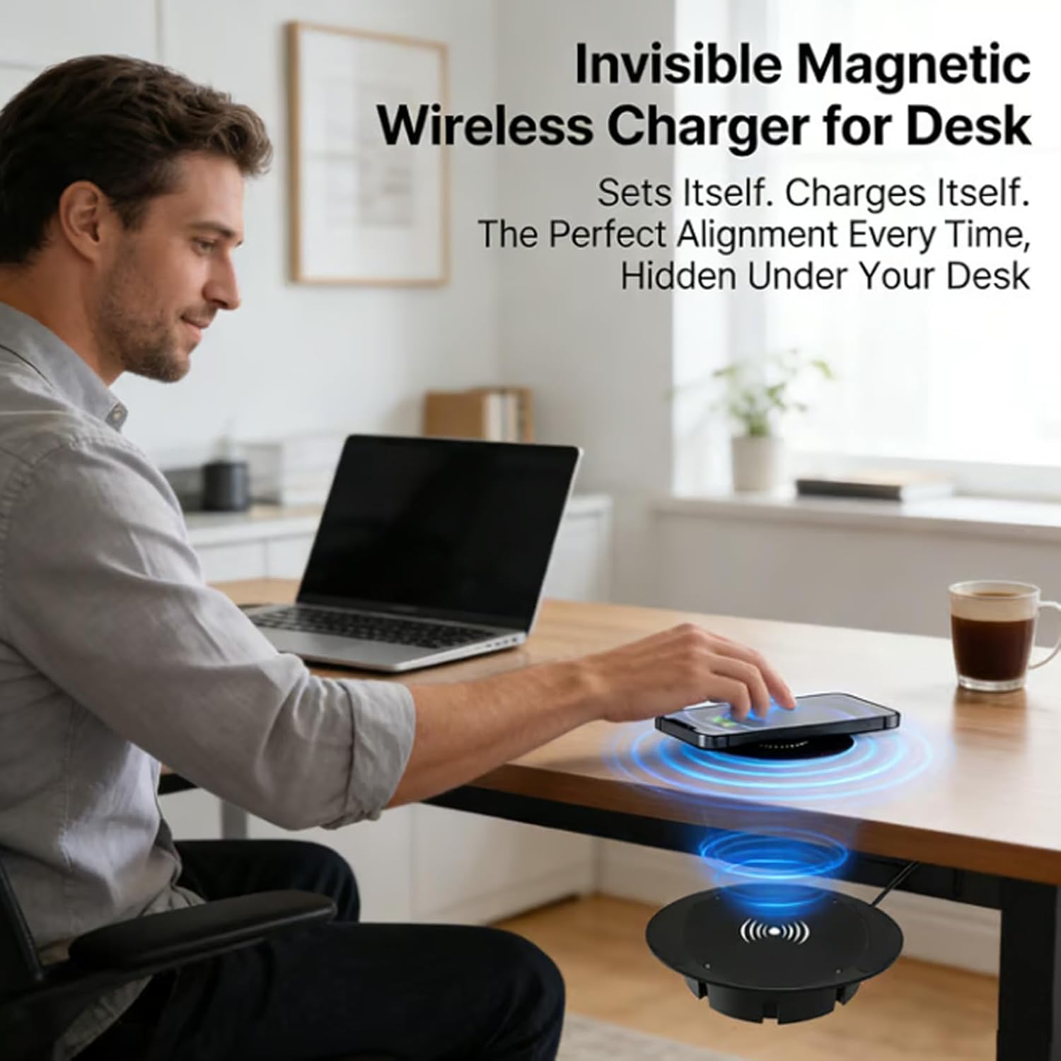 Transform any desk into a wireless charging station. Hidden installation, powerful performance, zero clutter.